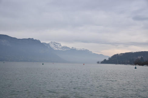On Saturday, I went to Annecy! Annecy is a mid-sized city in the Haute-Savoie department of the Auvergne-Rhône-Alpes region, in eastern France. It sits on the coast of Lake Annecy. It's about a two hour bus ride from Lyon. Or at least it should be. My bus left at 8:30 a.m., and we soon ran into traffic. The bus driver warned us that if the traffic kept up, we might have to stop for a break; apparently France requires that buses cannot drive for more than three hours without giving passengers a 30 minute break. Around 10 a.m.--when we should have been arriving--I checked Google Maps and realized we were still over an hour away from Annecy. About 45 minutes away from the city, we did end up stopping at a rest stop/park. The little park had a barely functioning coffee kiosk, vending machines, bathrooms (one without toilet paper, one without soap, and one that had both but was always occupied), and some cute climbing structures and in-ground trampolines. There was also an incredible view of a lake and mountains. The 30 minutes passed quickly as my traveling companions and I used the restrooms, attempted to get coffee, bounced on the trampolines, and snapped photos of the view.